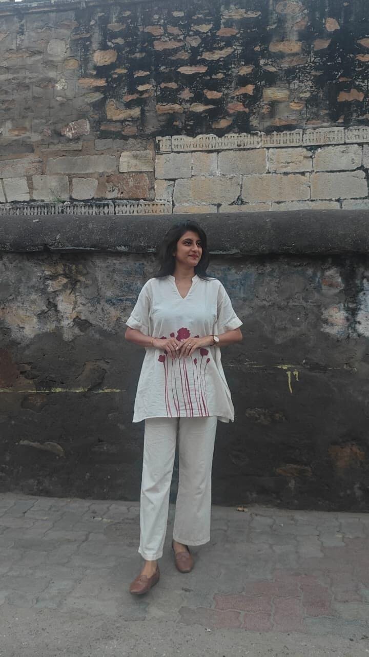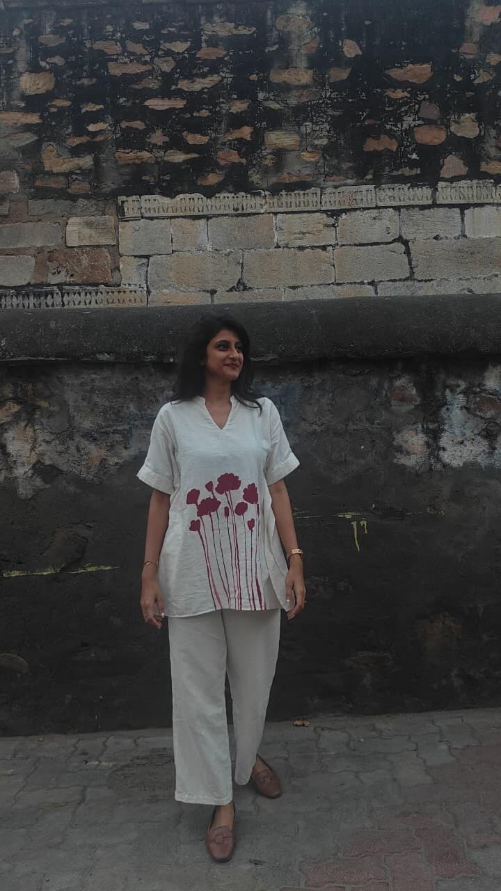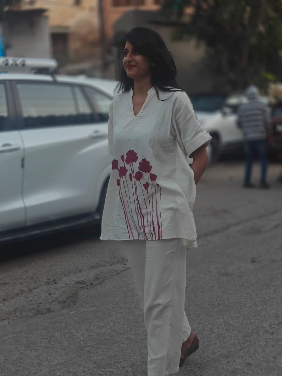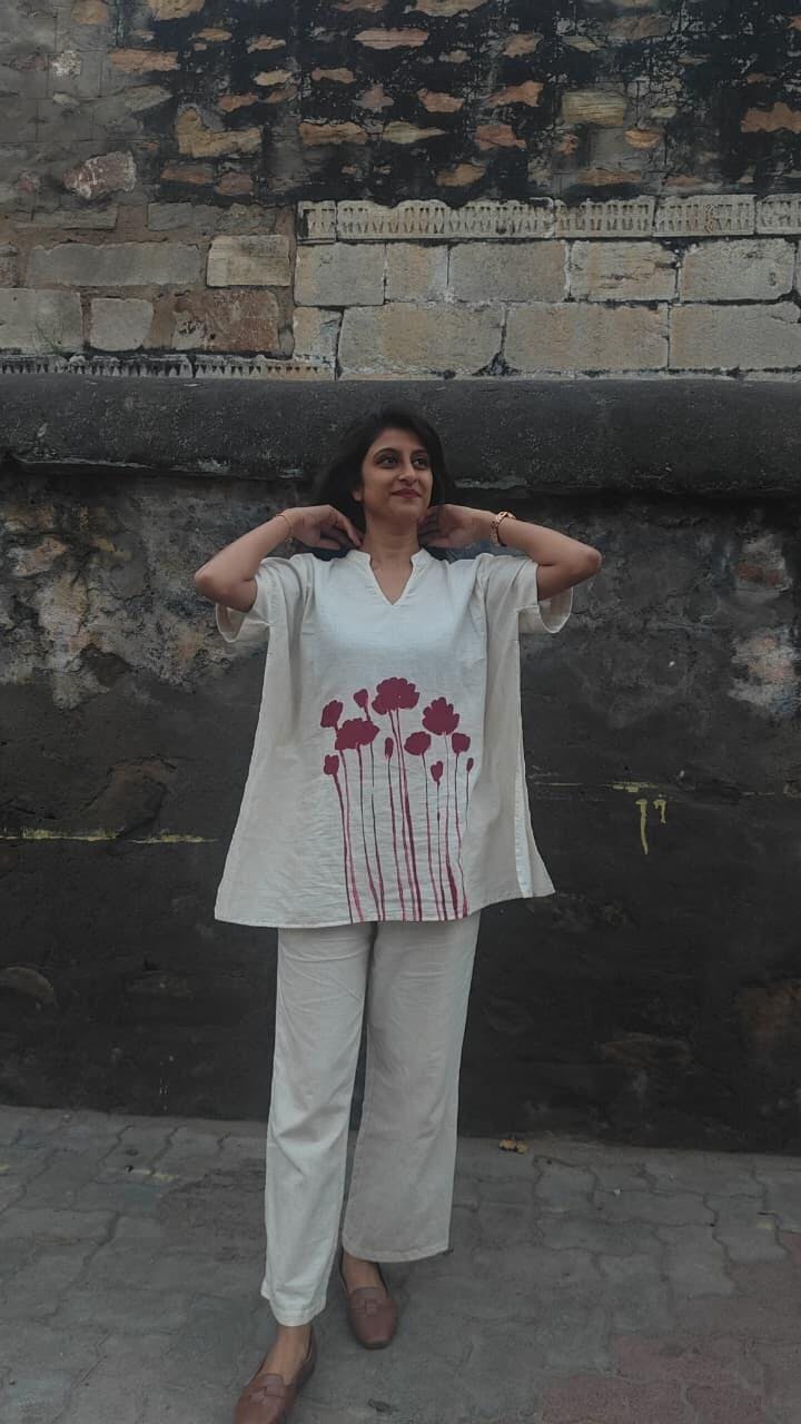 Off-White And Red Floral Print Tunic Cotton Flex Co-ord Set